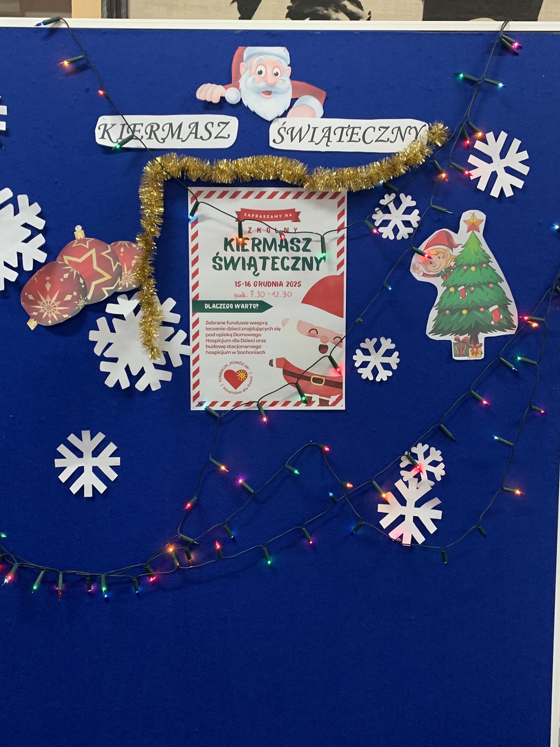 Tegoroczny BOŻONARODZENIOWY KIERMASZ CHARYTATYWNY zorganizowany 15 i 16 grudnia w „małym” i „dużym” budynku naszej szkoły cieszył się ogromnym zainteresowaniem uczniów, rodziców i nauczycieli. Efekt akcji, czyli sprzedaż ozdób choinkowych, stroików i kartek świątecznych przerósł nasze oczekiwania. Zebraliśmy rekordowe 8196, 93 zł! Jak co roku pieniądze przekazane zostały Hospicjum dla Dzieci – Fundacja „Pomóż Im”. Wraz z Wiceprezes Zarządu Fundacji „Pomóż Im” panią Joanną Czupryńską – Kwiatkowską dziękujemy Uczniom, Rodzicom i Nauczycielom Szkoły Podstawowej w Choroszczy za dobro płynące z Waszego serca, bo Wasz dar ma wielkie znaczenie.